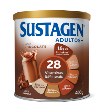 Sustagen Adultos+ é um complemento alimentar diário para adultos. Sua fórmula conta com uma combinação única de 28 vitaminas e minerais, como cálcio, ferro, vitamina D e proteína, dentre essas as que auxiliam na disposição, imunidade e na saúde óssea.